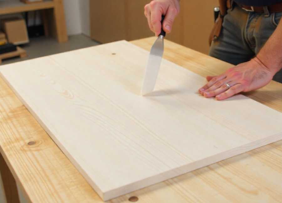 Sand lightly with 320-grit paper to prepare the surface. Apply a wood conditioner if working with softwood to prevent blotchy stain absorption.