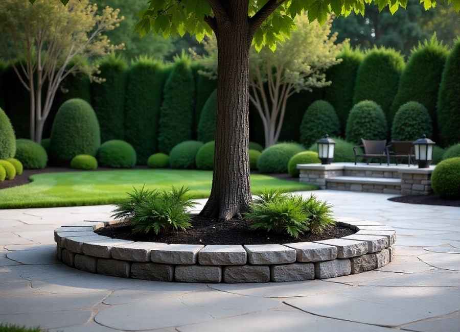 For a more modern and structured look, consider square or geometric patterns around the tree. This works well for sleek backyard designs and pairs wonderfully with contemporary homes.