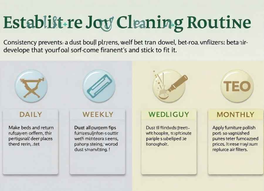 Consistency prevents dust buildup better than occasional deep cleaning marathons. Develop a routine that fits your schedule and stick to it: