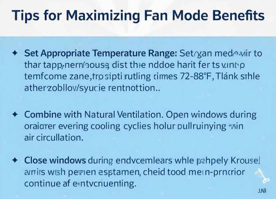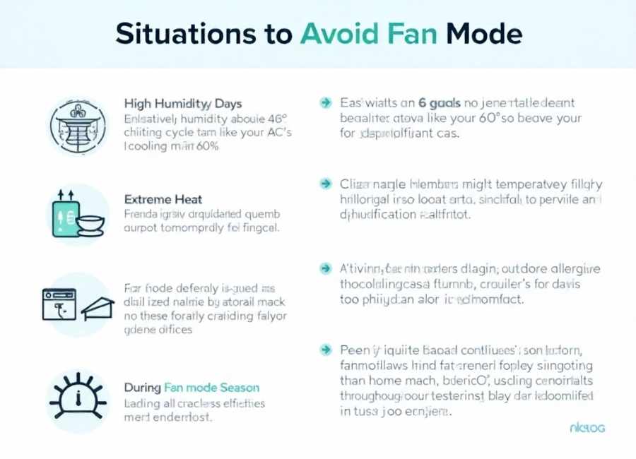 When outdoor temperatures exceed 85-90°F, fan mode alone typically won’t provide adequate comfort. The circulating air will be too warm to create the cooling sensation that makes fan mode effective.