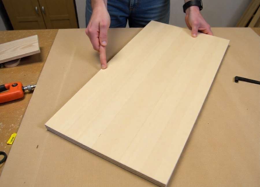 - Create a Saw Jig: If you do not have a track saw, you can turn your circular saw into a makeshift track saw with a simple jig. This will help you check that your door is square, either with a square or by measuring both diagonals. If the measurements match, the door is square. Small imperfections are usually fine and won’t affect function. If using MDF, your slab door is ready for finishing. For plywood, cover edges with iron-on edge banding, use an iron and a roller, trim excess, and sand for smoothness. Then, use a flush trim cutter, and use a sanding tool for smooth edges.