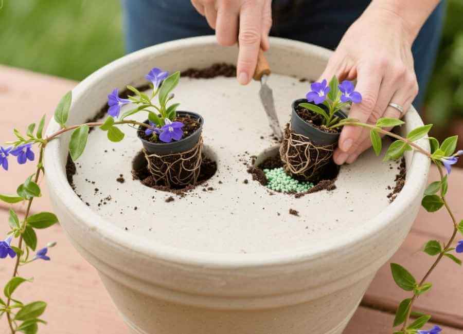 - Dig Holes: Make two holes on opposite edges of the container for the vinca vines.