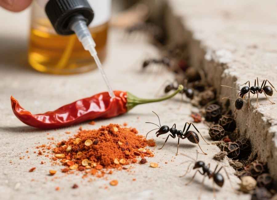 You can create an ant barrier by sprinkling powdered cayenne pepper along ant trails, near entry points, or around their nests. For a liquid solution, mix a teaspoon of cayenne pepper with water in a spray bottle and apply it directly to areas with ant traffic. Be careful when handling cayenne pepper, as it can irritate your skin and eyes.
