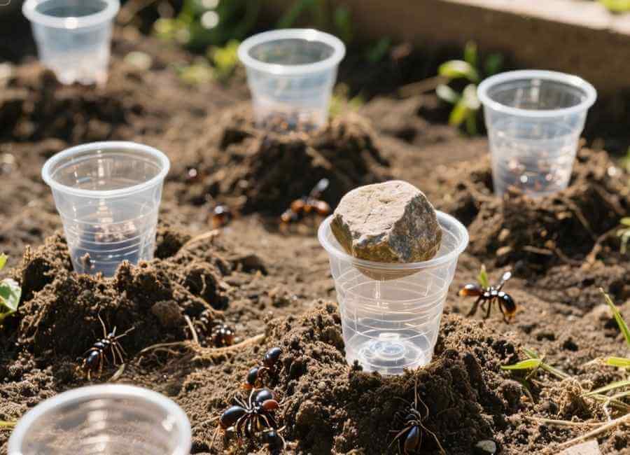 - To use, put the cup or bottle over the ant mound on a sunny day. The clear plastic traps sunlight and heats the soil underneath. (Soil Solarization – Gardening Solutions, n.d.) If it’s windy, put a small rock on top to hold it down. This also helps you reuse plastic items.