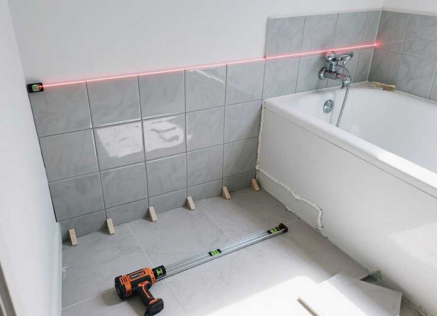 Tubs are rarely perfectly level. Use a laser to mark the top of your first row. Cut each bottom row tile to fit between the tub and the laser line. This creates a level base for your wall.