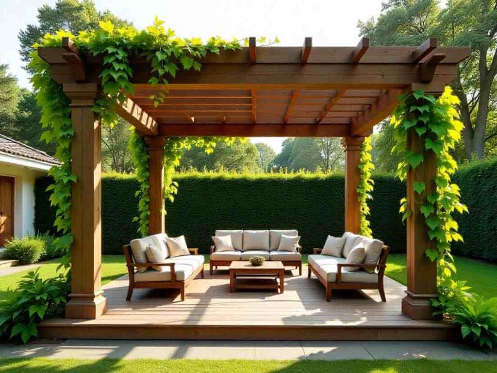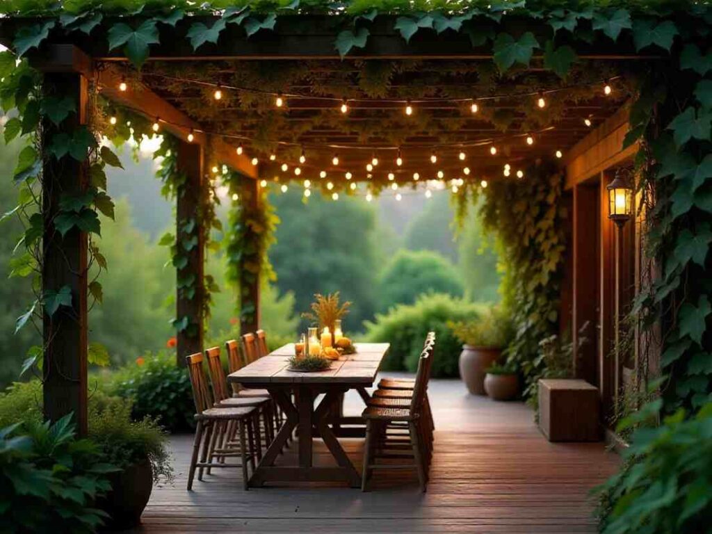 With a bit of patience, training draping vines over a pergola can provide If you have a bit of patience, training draping vines over a pergola provides a beautiful, natural covering for your deck. (Growing Vines on a Pergola Creates a Living Canopy That Makes Outdoor Spaces More Naturally Beautiful. Here’s How to Do It, 2022) The lush leaves and stems create a living canopy that adds color and texture, drawing the eye upward. This approach works especially well for an outdoor dining area, where a string of lights can create a magical atmosphere for evening meals.