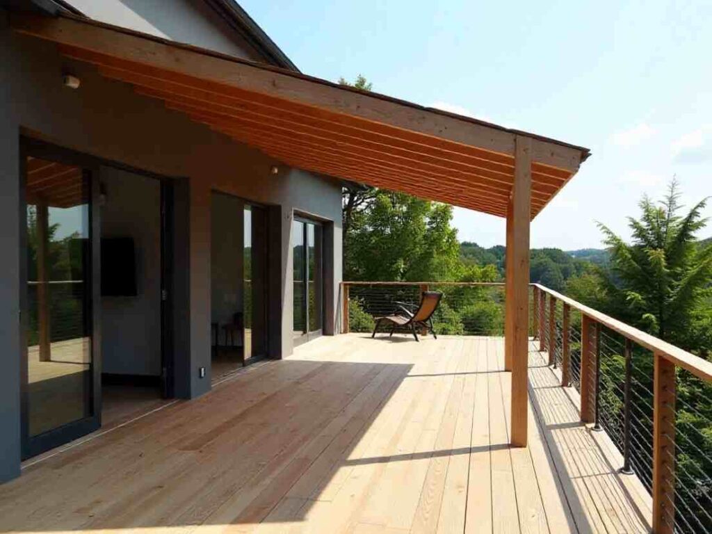 Attaching a sloped wood cover to your home is usually easier than building a separate structure. With just a few support beams, you can make a modern overhang. Using the same wood for both the cover and the deck floor helps the whole space feel connected and relaxed.