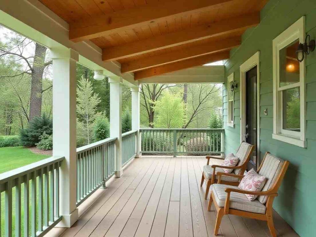 This covered deck uses the home’s existing overhang for shade. The wood beams in the ceiling match the deck floor, making the space look unified and well-designed. Adding color accents, like sage green trim, gives a gentle contrast to the siding and helps create a calm, welcoming feel.