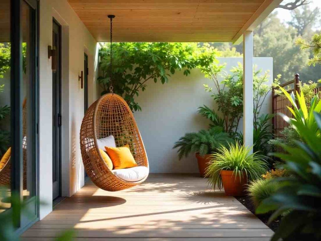 An overhang attached to the home makes a cozy, private spot on this entryway deck. Because most of the area is a walkway, a hanging egg chair is a smart way to add seating without taking up much space. Bright cushions and pillows add color to the shady corner.