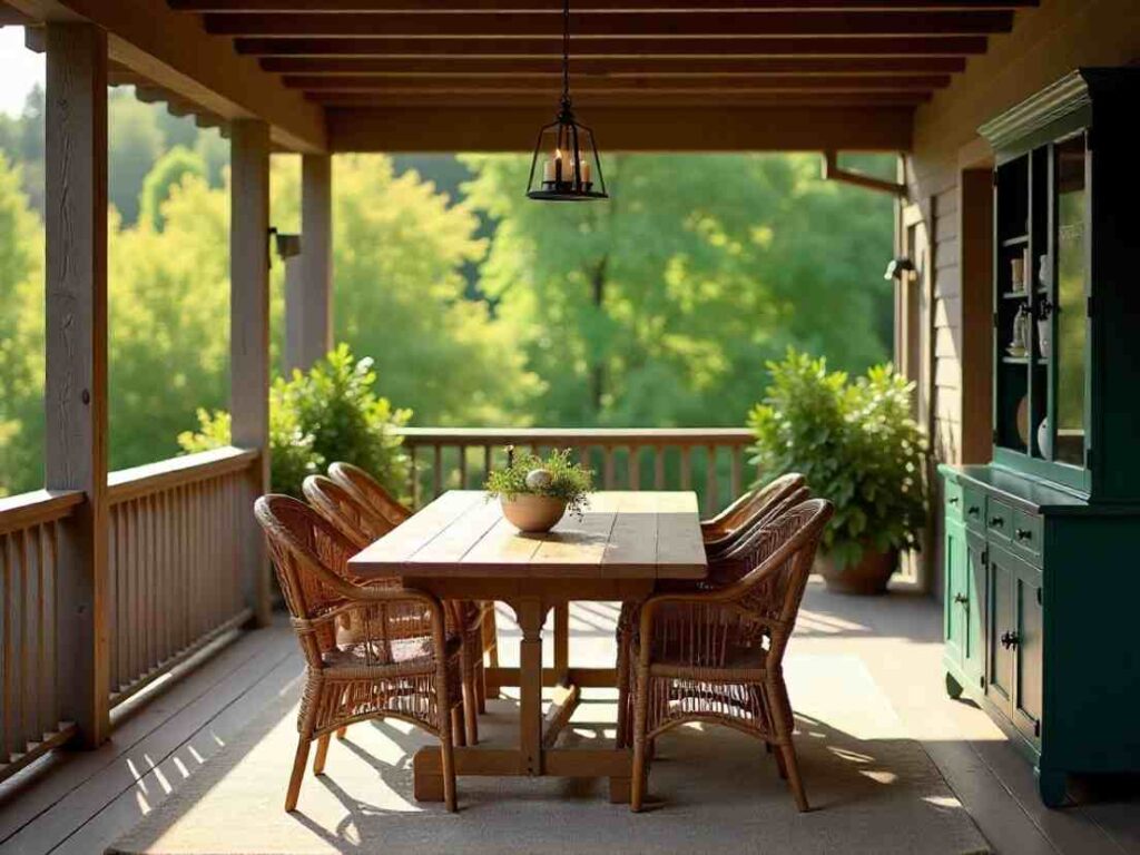 With its high ceiling and complete protection from the rain, this covered deck is an ideal spot for an outdoor dining room. The solid roof makes it possible to use a vintage wood dining Table and wicker chairs for warm-weather meals. A dark green hutch provides stylish storage for outdoor dishes and utensils.