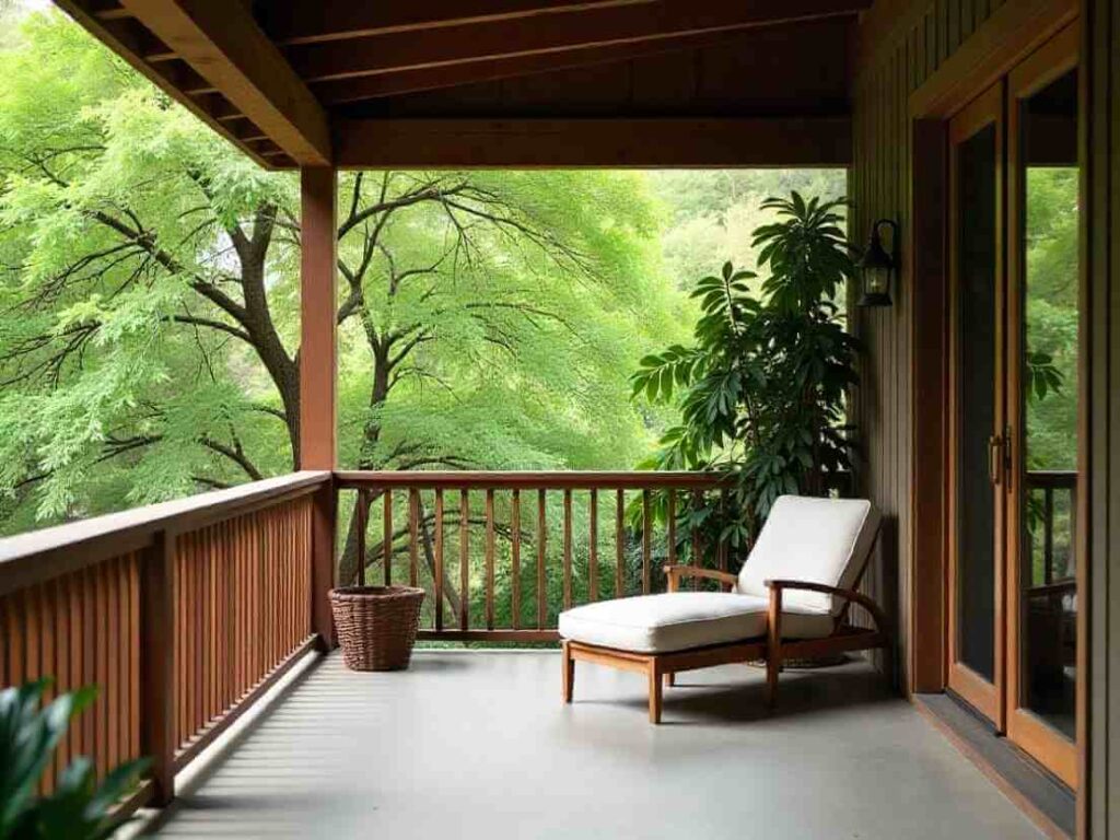 A balcony can naturally cover the deck or patio below it. In this example, the area under a second-story balcony becomes a sheltered spot for relaxing. A concrete slab gives a sturdy base for lounge chairs, and nearby trees add privacy.
