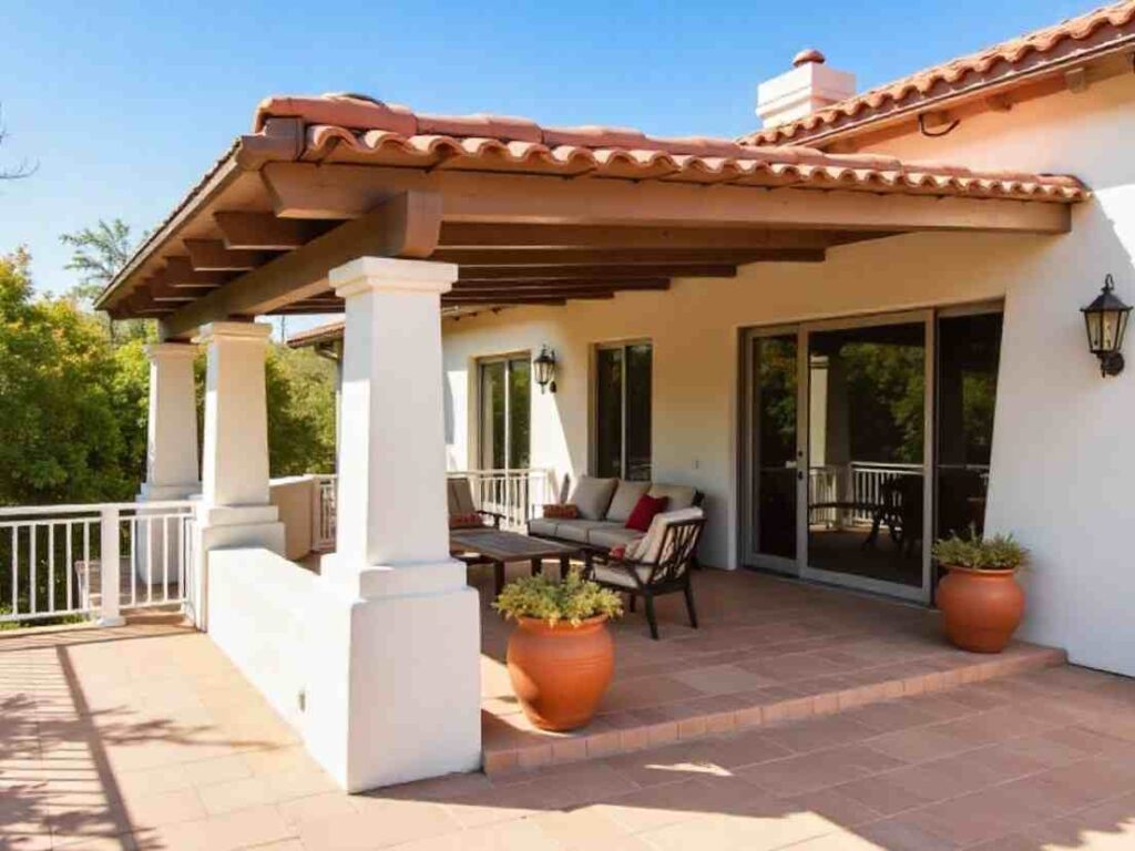 Inspired by classic Southwestern architecture, this design (Local Roof Styles That Define the Southwest, 2025) uses a sloped tile roof to protect the deck from sun and rain. White stucco walls and columns make it feel like an open-air room. Since only half the deck is covered, you can choose between sun and shade.