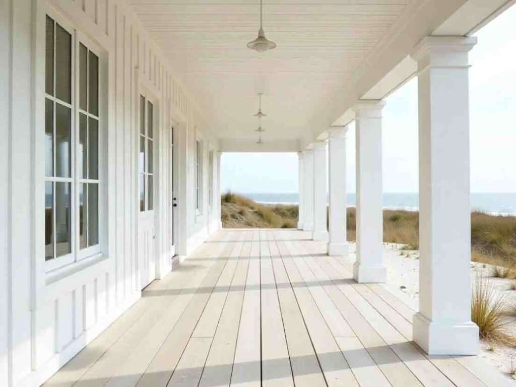 This coastal-inspired (Screened-In Porch Gallery, 2025) covered deck is almost completely enclosed, with windows providing protection from the elements and allowing for controlled airflow. A small open-air section, separated by columns, offers a connection to the outdoors. Keeping the walls and ceiling white and using pale wood for the floors helps to brighten the enclosed space.