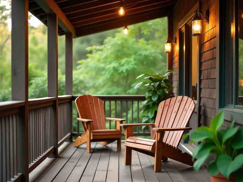 Even a small overhang can make a cozy spot for seating. This area isn’t big, but it fits a couple of Adirondack chairs. Hanging pendant lights make the nook feel even more welcoming and unique.