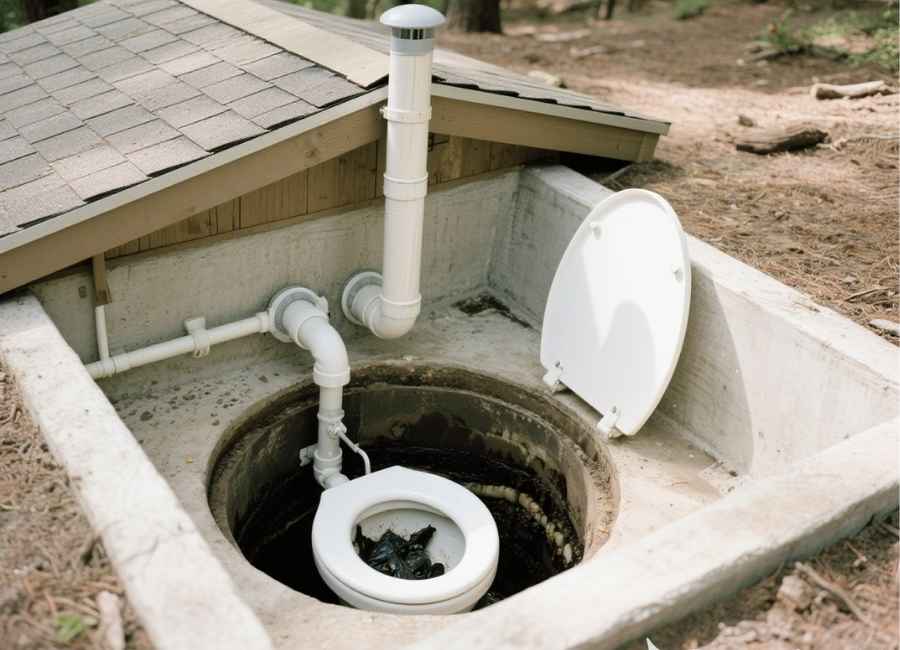 Ventilation: A vent pipe, usually at least three feet above the roof, is important. As the air in the vault warms up, it rises and leaves through the pipe, creating a natural draft. This brings fresh air in through the toilet riser or small vents, keeping air moving. In places with little airflow, like thick forests, a fan might be used to help.