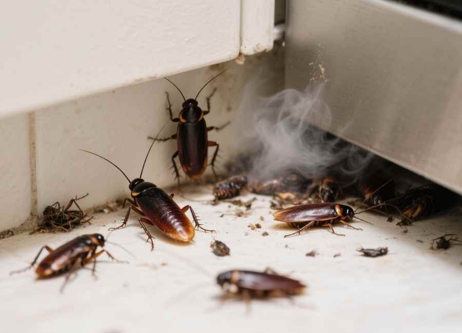 A strong, unpleasant smell with no clear source can mean you have many cockroaches. Some types give off chemicals that create a distinctive odour, often described as strong, oily, or musty, which gets worse as the infestation grows. Dead cockroaches are also under appliances. (Why can I smell cockroaches?, 2025) If you notice a strange smell that will not go away, especially in the kitchen or bathroom, check for other signs.