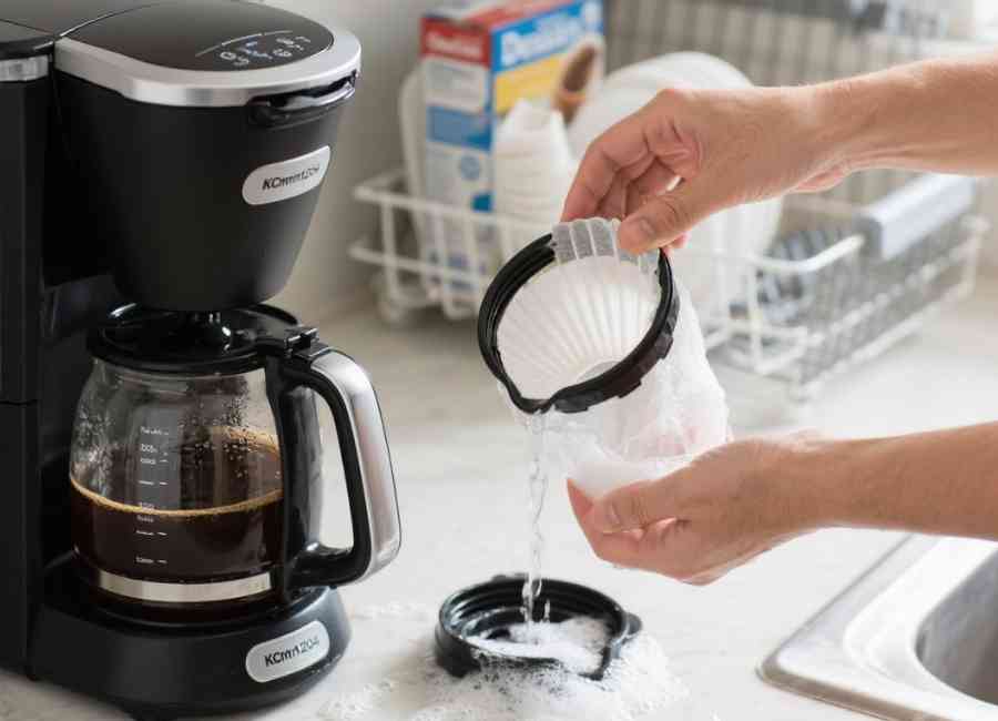 If you see a white film on your coffee maker, it’s time for a deep clean. Some manufacturers recommend descaling after every 100 brew cycles, which is about the same as a box of filters (KCM1204 Use and Care Guide, 2025). At the very least, deep clean your machine twice a year.