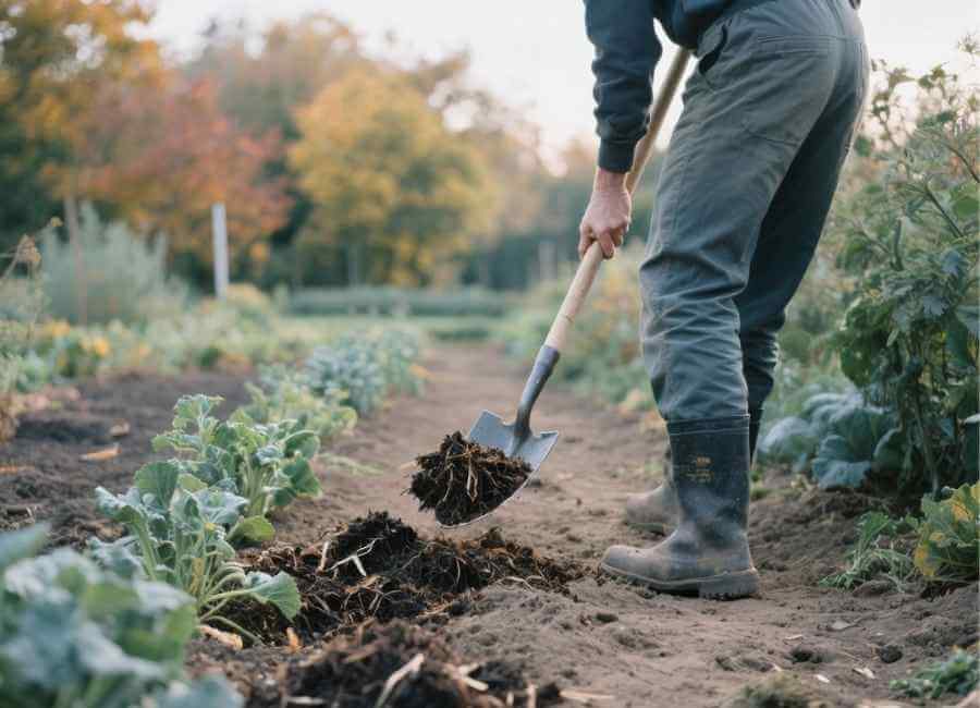 Apply a few inches of compost on the soil surface between your plants. Use a narrow spade or hand trowel to gently work the compost into the top few inches of soil. Be careful not to disturb your plants’ roots. As you work, move backwards to avoid stepping on and re-compacting the soil you’ve just turned.