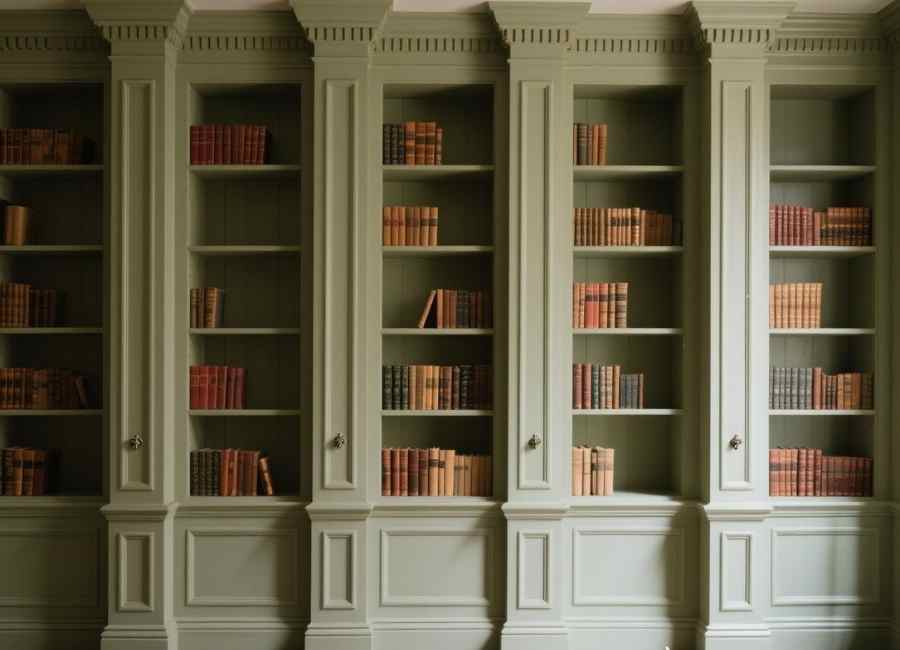 Place several identical bookcases side by side against a wall and secure them with anchors for added stability. To complete the “built-in” illusion, add decorative trim or molding along the top and bottom. Painting the bookcases the same color as the wall will help them blend in seamlessly, creating a sophisticated, library-like feel.