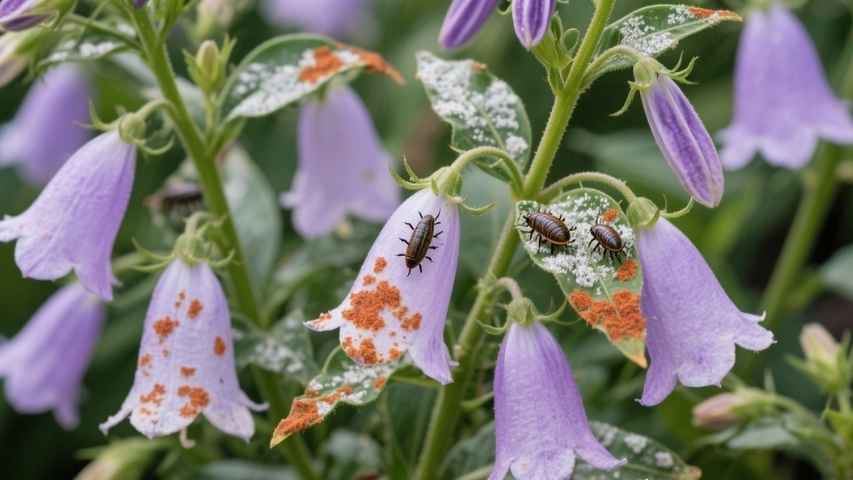 Rust and powdery mildew are two fungal diseases that can affect bellflowers, especially in damp conditions. Rust appears as light-colored spots on leaves with reddish-orange pustules on the undersides. Powdery mildew looks like a white or grey powder on the foliage. To prevent these diseases, water plants at the base and ensure proper spacing for good air circulation. If you see infected leaves, remove and destroy them to prevent the disease from spreading.