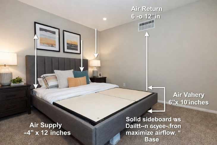 The type of bed frame you have makes a significant difference. A mattress placed directly on the floor over a vent will completely block airflow. This is inefficient and can also be a fire hazard with certain heating systems. (Peek & Rett, 2023)